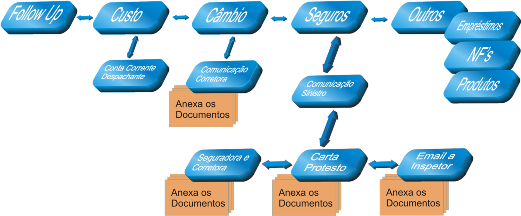 O Status de cada processo é acompanhado na tela específica - follow up, custos, conta corrente com o despachante aduaneiro, câmbio, seguro, etc. - indicando ainda a data e hora da atualização dessas informações.